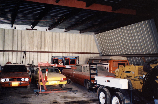 This is where Ludwig sat from sometime in August? 1993 (when he went kaput on 02McDonald) until April 2004: in a metal barn on the Melcher farm North of Stanton Nebraska, where I grew up. That's Ludwig tucked away in the corner. His cellmates, from left to right were a 1989? VW Cabriolet, a 1974 Porsche 914-4, and a 1968 Cadillac Coupe de Ville. Q: Which of these two vehicles are most similar? A: Ludwig's engine and transmission are completely interchangable with the little yellow Porsche's engine and transmission, the main differences being the Porsche powerplant is fuel injected and larger (2000cc cf. 1700cc, I think).